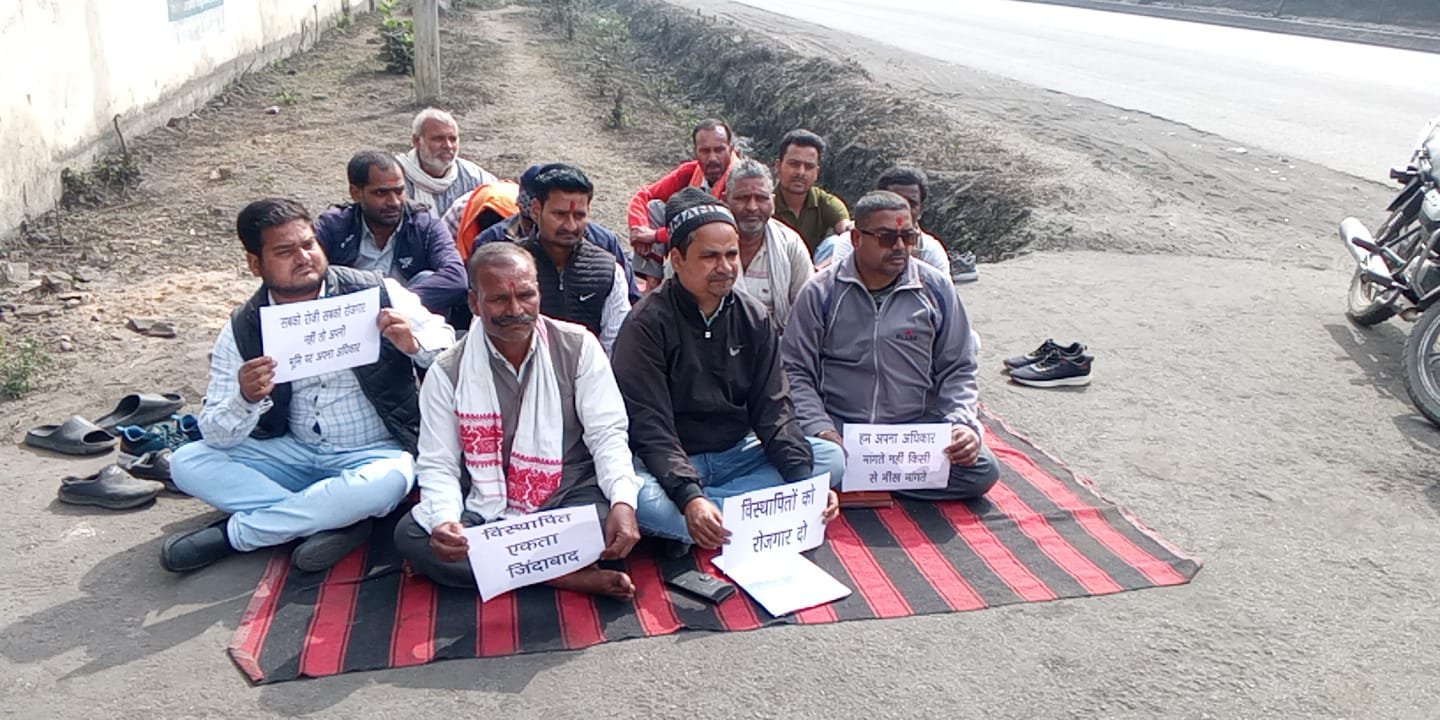रोजगार की मांग को लेकर धरने पर बैठे स्थानीय रहवासी।