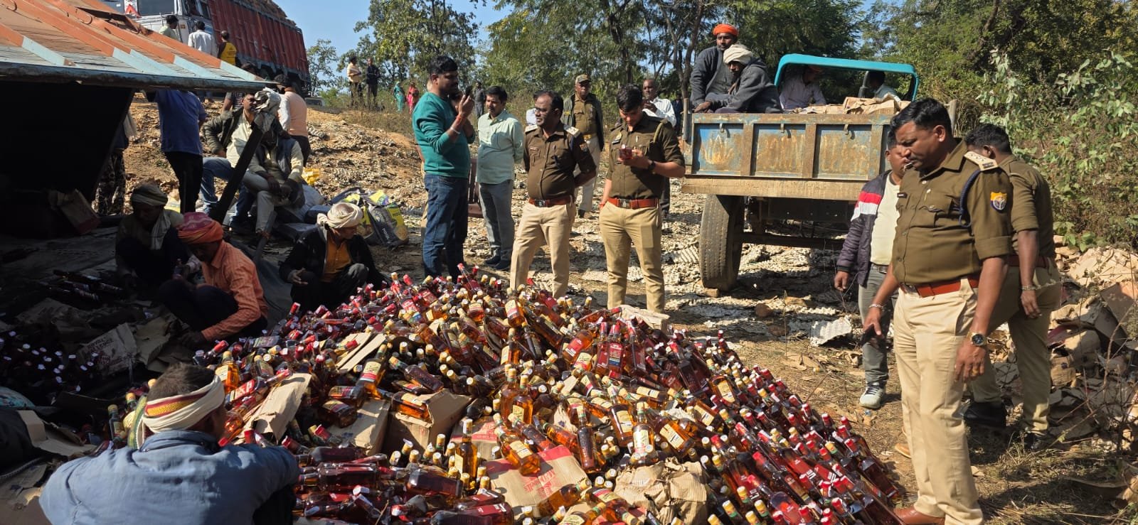 अवैध शराब का परिवहन कर रही टूक पलटने से जमीन पर बिखरी शराब की बोतल।।