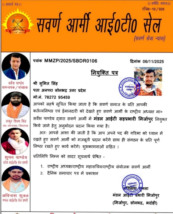 स्वर्ण आर्मी आईटी सेल ने अपने समर्पित सदस्य पत्रकार सुमित सिंह को मिर्जापुर मंडल सह प्रभारी नियुक्त कर सम्मानित किया