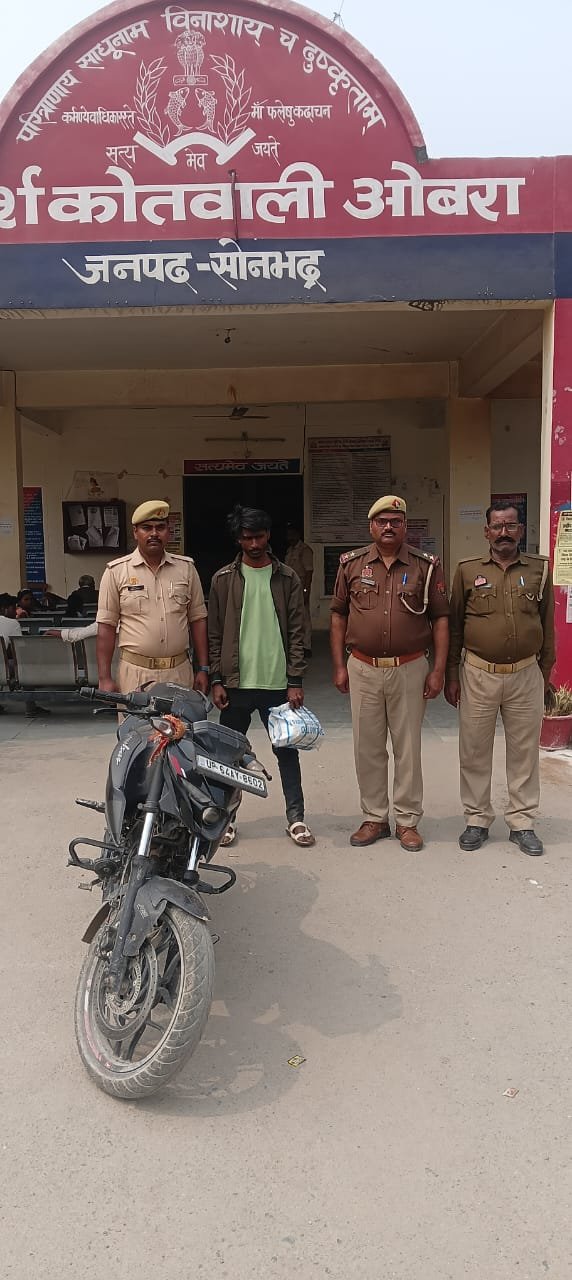 रेशमा खानम,,,सोनभद्र  ओबरा पुलिस द्वारा 01 किलो 100 ग्राम अवैध गांजा के साथ 01 अभियुक्त गिरफ्तार*पुलिस अधीक्षक सोनभद्र *श्री अभिषेक वर्मा* के निर्देशन में मादक पदार्थों के विरुद्ध चलाए जा रहे अभियान के क्रम में, अपर पुलिस अधीक्षक (मुख्यालय) श्री अनिल कुमार के पर्यवेक्षण व क्षेत्राधिकारी ओबरा श्री अमित कुमार के निर्देशन में थाना ओबरा पुलिस द्वारा दिनांक 09.03.2026 को एक अभियुक्त के कब्जे से 01 किलो 100 ग्राम अवैध गांजा, व एक मोटरसाइकिल (UP64AY8602) बरामद कर गिरफ्तार किया गया ।