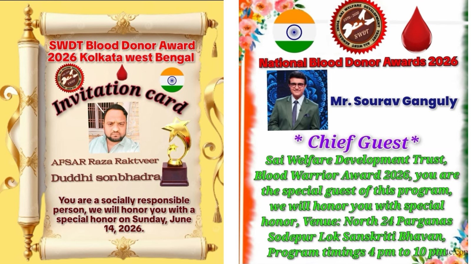 दुद्धी/ सोनभद्र। 14 जून 2026 को सोंदेपुर लोक संस्कृति भवन, नॉर्थ 24 परगना, कोलकाता (पश्चिम बंगाल) मे उम्मीद फाउंडेशन के संस्थापक रक्तवीर अफसार रज़ा को “नेशनल ब्लड डोनर अवार्ड 2026” से सम्मानित किया जाएगा। यह सम्मान साई वेलफेयर डेवलपमेंट ट्रस्ट (SWDT) द्वारा कोलकाता मे आयोजित भव्य समारोह मे मुख्य अतिथि पूर्व भारतीय क्रिकेट टीम के कप्तान सौरव गांगुली के हाथों प्रदान किया जाएगा।