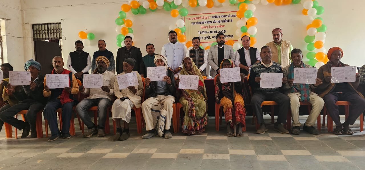 दुद्धी / सोनभद्र । स्थानीय दुद्धी तहसील सभागर मे आज शनिवार को स्वामित्व योजना के लाभार्थियों को घरौनी प्रमाण पत्र वितरित किया गया । इसके साथ तहसील क्षेत्र के अंतर्गत कुल 22 ग्राम पंचायतों मे कुल 409 घरौनी प्रमाण पत्रों का वितरण किया। कार्यक्रम का शुभारम्भ मुख्य अतिथि एसी एसटी आयोग के प्रदेश उपाध्यक्ष जीत सिंह खरवार , विशिष्ठ अतिथि नगर पंचायत अध्यक्ष कमलेश मोहन व श्रवण गोंड ने संयुक्त रूप से माँ सरवस्ती के चित्र पर पुष्प अर्पित व दीप प्रज्वल्लित कर किया।