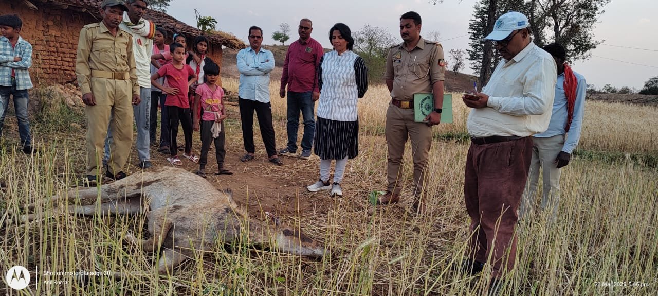 दुद्धी / सोनभद्र।स्थानीय तहसील क्षेत्र अंतर्गत ग्राम बघाडू वन रेंज क्षेत्र के पुनर्वास महुअरिया मे एक छह वर्षीय नीलगाय की चोट लगने से मौत हो जाने का मामला प्रकाश मे आया है । ग्रामीणों ने नीलगाय की मौत होने की सूचना वन क्षेत्राधिकारी सरिता को दिया।जिसके बाद वन दरोगा और वन बीट रक्षक मौके पर पहुंचकर घटनास्थल का जायजा लिया ।तत्पश्चात वन क्षेत्राधिकारियों की उपस्थिति में पशु चिकित्साधिकारी डॉ रुदेश यादव , फार्मासिस्ट अनिल कुमार उर्फ गुड्डू व अन्य चिकित्सा कर्मचारीयों की टीम ने मृतक नीलगाय का पोस्टमार्टम किया ।उसके बाद वनाधिकारियों व ग्रामीणों की मौजूदगी मे नीलगाय को गड्ढा खोद कर दफन कर दिया गया है ।