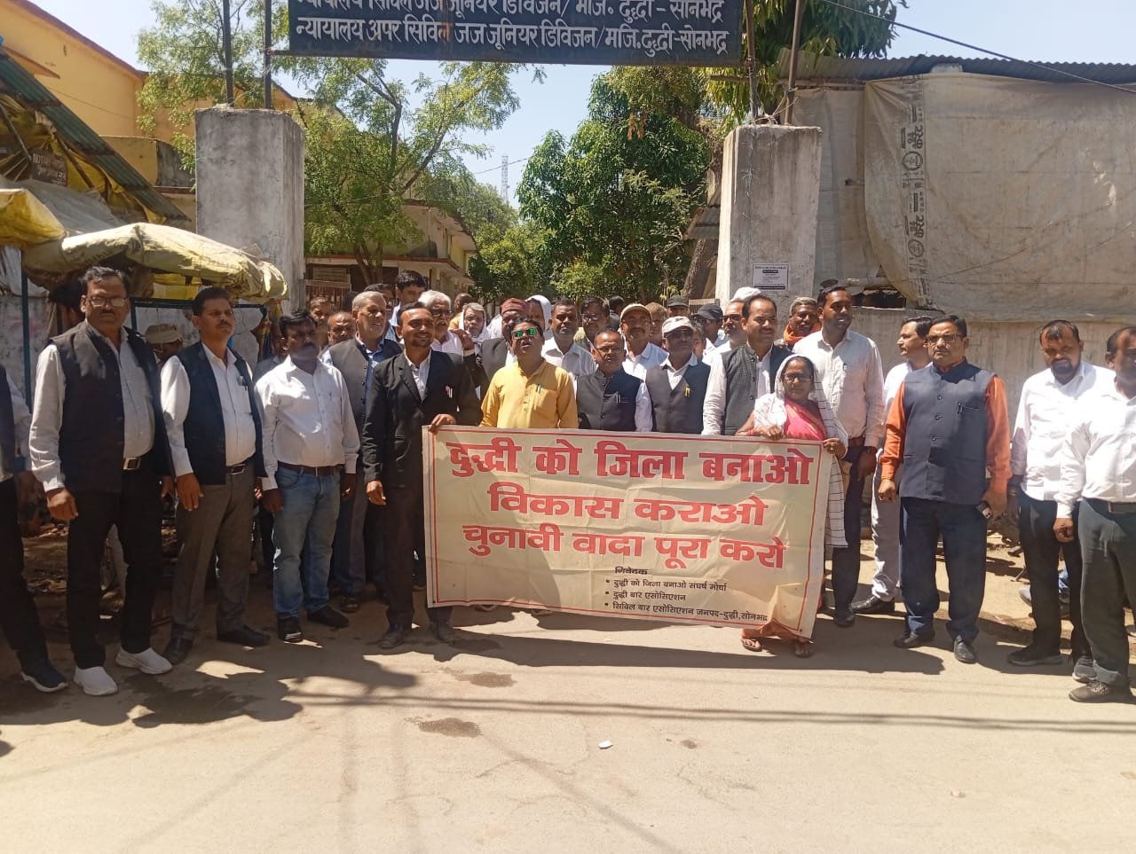 दुद्धी / सोनभद्र । स्थानीय कस्बा स्थित कचहरी के मुख्य द्वार पर शनिवार को दोपहर अधिवक्ताओं एवं संघर्ष समिति ने संयुक्तरूप से दुद्धी को जिला बनाने की मांग को लेकर जमकर प्रदर्शन व नारेबाजी किया। इस दौरान वक्ताओं ने कहा कि तीन प्रान्तों से घिरा दुद्धी तहसील क्षेत्र आदिवासी बाहुल्य पिछड़ा, नक्सल प्रभावित क्षेत्र है। दुद्धी तहसील का बॉर्डर सोनभद्र जनपद मुख्यालय से 150 किलोमीटर की दूरी पर है। इसके साथ ही दुद्धी जिला बनने के सभी मानक को भी पूरा कर रहा है और सरकार को भारी मात्रा मे रेवेन्यू दुद्धी से मिलता है फिर भी दुद्धी को जिला नही बनाया गया।कहा कि दुद्धी को जिला बनाये जाने की मांग पिछले तीन दशकों से किया जा रहा है। सिविल बार एसोसिएशन के अध्यक्ष विष्णु कांत तिवारी ने कहा की पिछले चुनाव के दौरान प्रदेश व केंद्र के मंत्रियों व नेताओं ने दुद्धी को जिला बनाने का वादा किया था। इसलिए चुनावी वादा पूरा करते हुए दुद्धी को जिला बनाया जाए और विकास कराया जाए। संघर्ष समिति के महासचिव प्रभु सिंह कुशवाहा ने कहा कि वर्षों से जिला बनाए जाने की मांग की जा रही है उसके बावजूद शासन स्तर से कोई सकारात्मक और ठोस कदम नहीं उठाया जा रहा है जबकि प्रशासनिक स्तर से जिले बनाए जाने संबंधित रिपोर्ट शासन को भेजी गई है। इस मौके पर दुद्धी बार एसोसिएशन के अध्यक्ष प्रेमचंद यादव ,राकेश कुमार ,उमेश चंद ,नंदलाल, कुलभूषण पांडे , सत्यनारायण यादव ,राकेश श्रीवास्तव, दिनेश कुमार ,प्रेमचंद गुप्ता, आशीष गुप्ता ,राकेश कुमार अग्रहरि, अमरावती देवी ,कृष्णा कुमार सहित काफी संख्या मे दुद्धी कचहरी के अधिवक्तागण एवं संघर्ष समिति के पदाधिकारी व सदस्य मौजूद रहें।