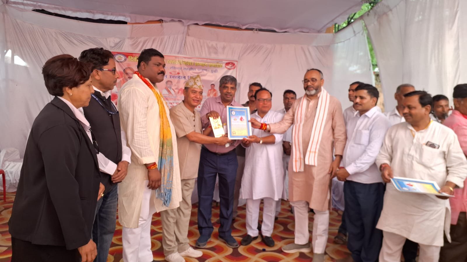 दुद्धी / सोनभद्र। दुद्धी के पवित्र धरती पर लगातार दूसरी बार विशाल रुप से रक्तदान शिविर व अंतरराष्ट्रीय रक्तक्रांति वीर सम्मान समारोह का आयोजन तहसील परिसर के रामलीला मंच पर किया गया। कार्यक्रम के मुख्य अतिथि सदर विधायक भूपेश चौबे ने कहा कि पिछड़ा क्षेत्र होने की वजह से रक्तदान करने मे यहाँ के लोग परहेज करते हैं। इस तरह का आयोजन एक पिछड़े इलाके मे किया गया। यह बहुत बड़ी उपलब्धि है। रक्तदान कार्यक्रम मे हमारी उपस्थिति जरूर होती है। रक्त कहीं फैक्ट्री या दुकान पर नहीं मिलता शरीर से बनता है। इसलिए रक्तदान करना बहुत बड़ी जिम्मेदारी है। विशिष्ट अतिथि श्रवण सिंह गोंड , रविन्द्र जायसवाल ने कहा की देश के अलग-अलग राज्यों से आये सभी रक्तबीरों ने ब्लड डोनेट कर दुद्धी को जागरूक करने का काम किया है। कार्यक्रम की अध्यक्षता चेयरमैन कमलेश मोहन ने किया। कार्यक्रम के पूर्व भूटान, नेपाल, आंध्र प्रदेश, महाराष्ट्र ,छत्तीसगढ़ ,झारखंड, बिहार, पश्चिम बंगाल, मध्य प्रदेश लखनऊ उन्नाव साहित अलग-अलग राज्यों से आए रक्तवीरों ने भव्य रूप से जुलूस निकाल कर नगर भ्रमण किया। नगर भ्रमण के दौरान डीजे के धुन पर नाचते झूमते रक्तदान करने का अपील किया। तहसील परिसर मे रक्तबीरों ने दुद्धी ब्लड सेंटर को आठ यूनिट राबर्ट्सगंज ब्लड सेंटर को 10 यूनिट ब्लड डोनेट किया। कार्यक्रम के दौरान रामलीला मंच पर सांस्कृतिक कार्यक्रम में विभिन्न छात्रों ने प्रतिभाग किया। इस मौके पर प्रगति फाउंडेशन ट्रस्ट एवं दुद्धी ब्लड डोनेट ग्रुप के संस्थापक