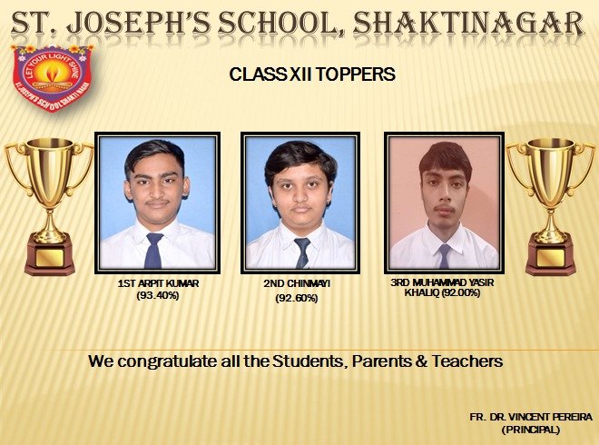 शक्तिनगर/सोनभद्र सीबीएसई बोर्ड द्वारा घोषित परीक्षाफल में एनटीपीसी शक्तिनगर के आवासीय परिसर में स्थित संत जोसेफ़ स्कूल के अर्पित कुमार ने 93.4% अंक अर्जित कर 12वीं में टॉप किया तो चिन्मयी ने 92.6% अंक प्राप्त करके द्वितीय स्थान पर कब्जा किया, वहीं मो0 यासिर खालिक ने 92% के साथ तृतीय स्थान हासिल किया। विद्यालय के प्रधानाचार्य फादर डॉ0 विंसेंट परेरा ने सभी उत्तीर्ण छात्रों, अभिभावकों तथा शिक्षकों को बधाई देते हुए अपने शुभकामना संदेश में कहा कि होनहार छात्र अपनी प्रतिभा व अथक परिश्रम के द्वारा परीक्षाओं में उत्कृष्ट प्रदर्शन कर न केवल स्वयं का अपितु अन्य छात्रों के लिए भी ऊर्जा का संचार करते हैं।