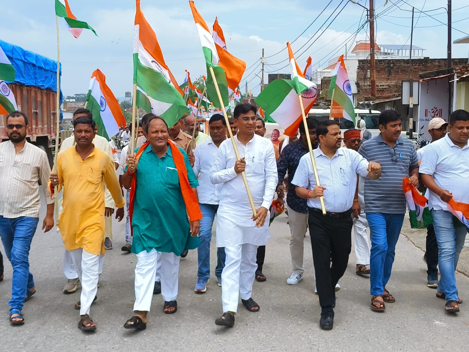 चोपन/सोनभद्र । आजादी के अमृत महोत्सव एवं ‘हर घर तिरंगा’ अभियान के तहत नगर पंचायत चोपन में नगर पंचायत अध्यक्ष उस्मान अली तथा अधिशासी अधिकारी मधुसूदन जायसवाल के नेतृत्व में नगर पंचायत के समस्त कर्मचारियों द्वारा भव्य तिरंगा यात्रा का आयोजन किया गया। तिरंगा यात्रा का शुभारंभ नगर पंचायत कार्यालय परिसर से हुआ, जिसमें कर्मचारियों ने हाथों में तिरंगा लेकर देशभक्ति के नारे लगाए। यात्रा मुख्य बाजार, प्रमुख मार्गों से होते हुए पुनः नगर पंचायत कार्यालय पहुंचकर सम्पन्न हुई। इस दौरान पूरे नगर में देशभक्ति का उत्साह एवं जोश देखने को मिला। अध्यक्ष उस्मान अली ने कहा कि तिरंगा केवल हमारे देश की आन, बान और शान का प्रतीक ही नहीं, बल्कि यह हमें एकता, सम्मान और बलिदान की प्रेरणा देता है। अधिशासी अधिकारी मधुसूदन जायसवाल ने कहा कि इस प्रकार के आयोजनों से लोगों में राष्ट्रप्रेम की भावना प्रबल होती है और हर नागरिक को अपने कर्तव्यों के प्रति जागरूक रहने का संदेश मिलता है। तिरंगा यात्रा में नगर पंचायत के समस्त अधिकारी-कर्मचारी, स्थानीय नागरिकगण भी शामिल हुए। पूरे मार्ग में लोगों ने तिरंगा यात्रा का स्वागत किया और देशभक्ति गीतों की गूंज से वातावरण रोमांचित हो उठा। इस मौके पर दिनेश गर्ग, जीतू सिंह, राजनरायन निषाद, दिनेश जैन, अमित सिंह, सभासद रामपरीखा विश्वकर्मा, दिव्यविकास सिंह, सलीम कुरैशी, नरेश यादव, विनीत जाटव, सुशील साहनी, अनिकेत निषाद, नागेन्द्र यादव, अनिल जायसवाल,अरुण कुमार, विकास चौबे, रामनरेश चौधरी, अभिषेक दुबे, मनोज शुक्ला, लिपिक अंकित पांडेय, मंसूर अलम, रोहित तिवारी इत्यादि लोग उपस्थित रहे।