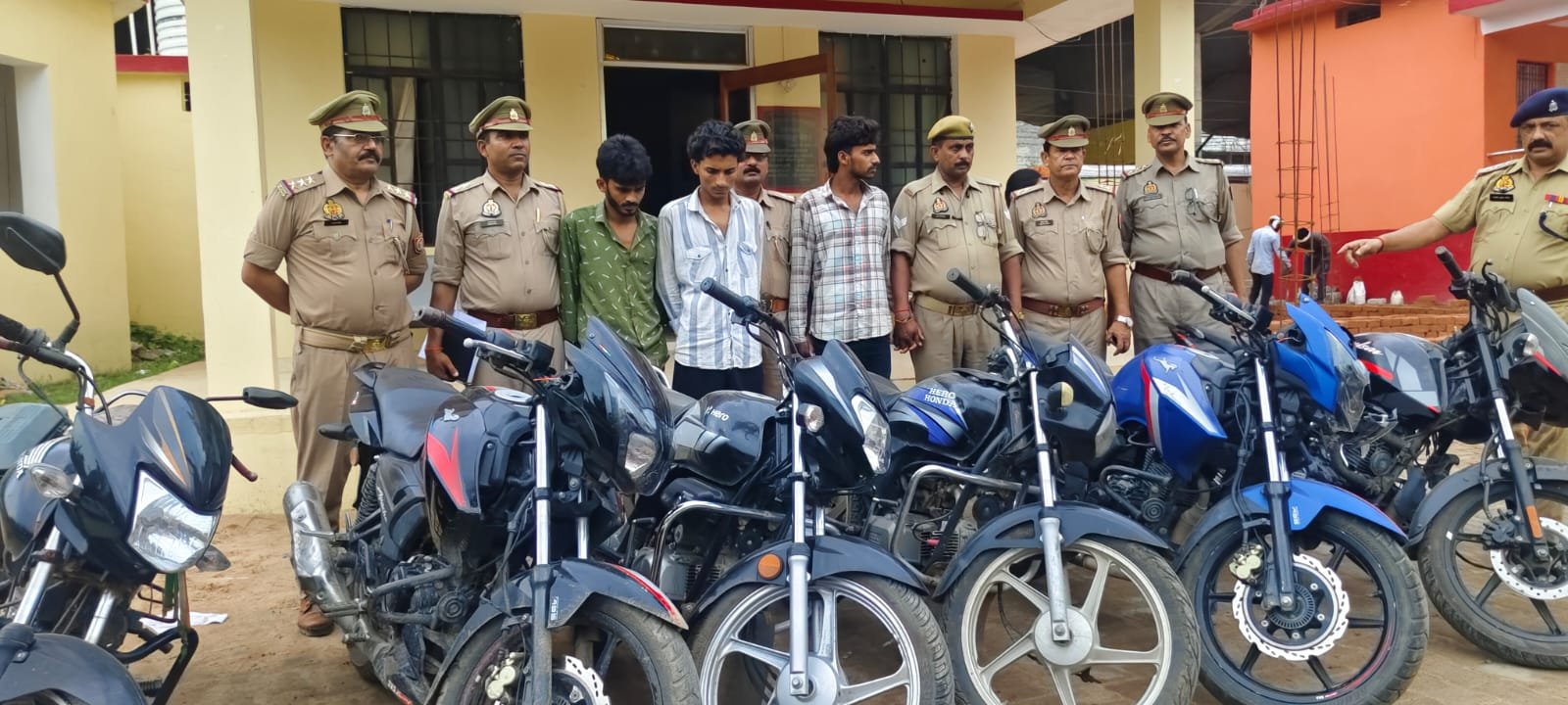रॉबर्ट्सगंज /सोनभद्र 6 मोटरसाइकिलों के साथ तीन चोरों को किया गया गिरफ्तार-*पुलिस अधीक्षक सोनभद्र, श्री अशोक कुमार मीणा के द्वारा जनपद सोनभद्र में चोरी की घटनाओं पर अंकुश लगाने व चोरी की घटनाओं का शीघ्र अनावरण व उसमें संलिप्त अपराधियों की गिरफ्तारी हेतु चलाये जा रहे अभियान के क्रम में अपर पुलिस अधीक्षक (मुख्यालय) श्री अनिल कुमार के निर्देशन में व क्षेत्राधिकारी नगर श्री रणधीर कुमार मिश्रा के कुशल पर्यवेक्षण में दिनांक-28/29.08.2025 की रात्रि को थाना रॉबर्ट्सगंज पुलिस की टीम ने मुखबिर की सूचना पर चुर्क जाने वाले मार्ग के बगल में बने एक टीनशेड से 06 अदद मोटरसाइकिलों के साथ 03 चोरों को गिरफ्तार किया गया । इस सम्बन्ध में थाना रॉबर्ट्सगंज पर मु0अ0सं0-896/2025 धारा 317(2), 317(3), 317(4), 319(2), 318(4), 338, 336(3), 340(2) बीएनएस का अभियोग पंजीकृत कर अग्रिम विधिक कार्यवाही की जा रही है ।