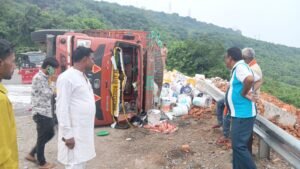 पेन्ट लदा डीसीएम ट्रक अनियंत्रित होकर पलटी,हादसे मे चालक – खलासी बाल-बाल बचे।