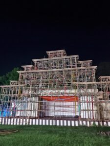 पैराडाइज प्रेक्षागृह के प्रांगण में एक आकर्षक एवं भव्य पंडाल का निर्माण कार्य तेजी से चल रहा है।उक्त आशय की जानकारी देते हुये समिति के सचिव समित मण्डल ने बताया कि समिति के सदस्यों एवं कलकत्ता से आये हुये दर्जनों कुशल कारीगरों ने गोपाल मुखर्जी के नेतृत्व में पंडाल विशेषज्ञों द्वारा किये जा रहे दिन-रात मेहनत से तैयारियाँ अंतिम चरण में पहुँच चुकी हैं।वही बंगाल से आए मूर्तिकार मूर्तियां तैयार करने में लगे हैं।कारीगरों द्वारा इस बार लगभग 65 फ़ीट का भव्य पंडाल का निर्माण किया जा रहा है।